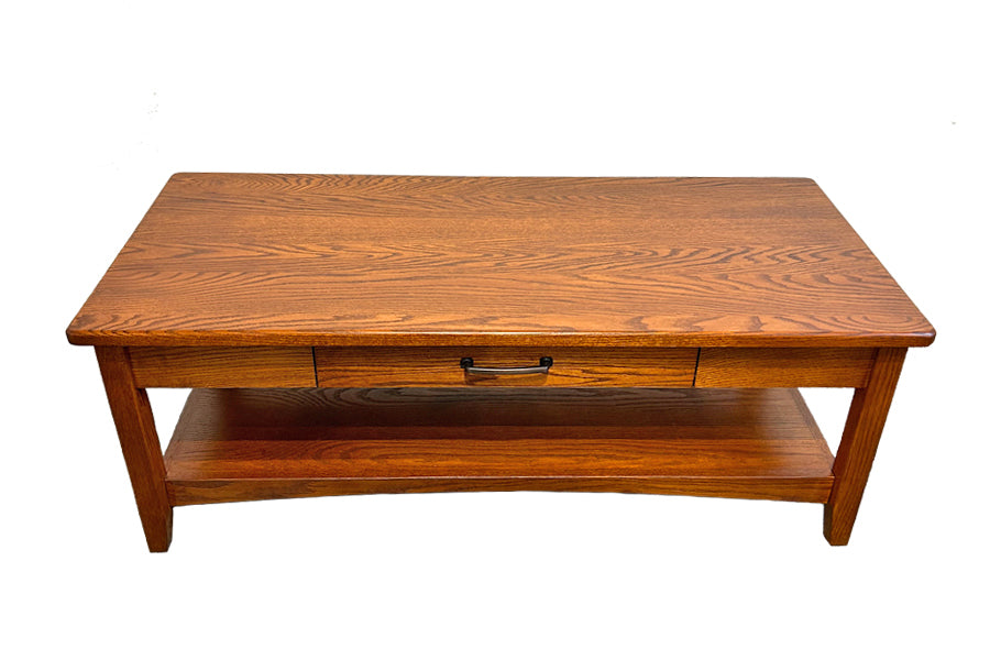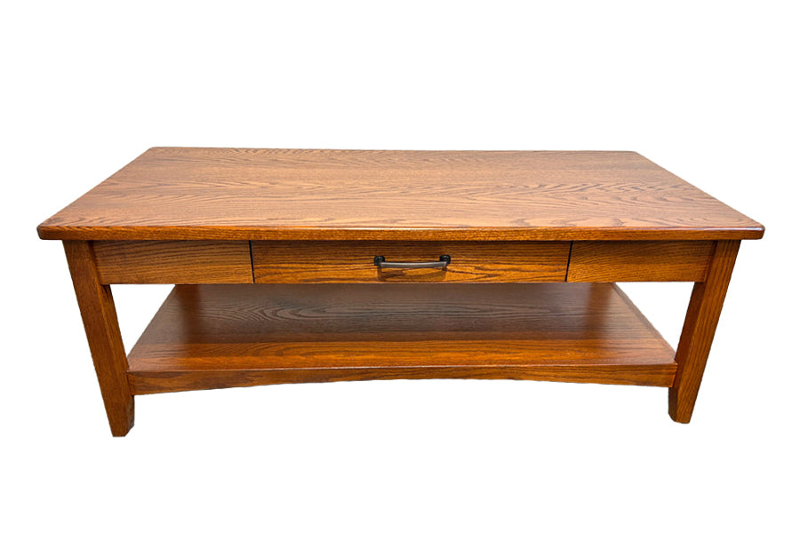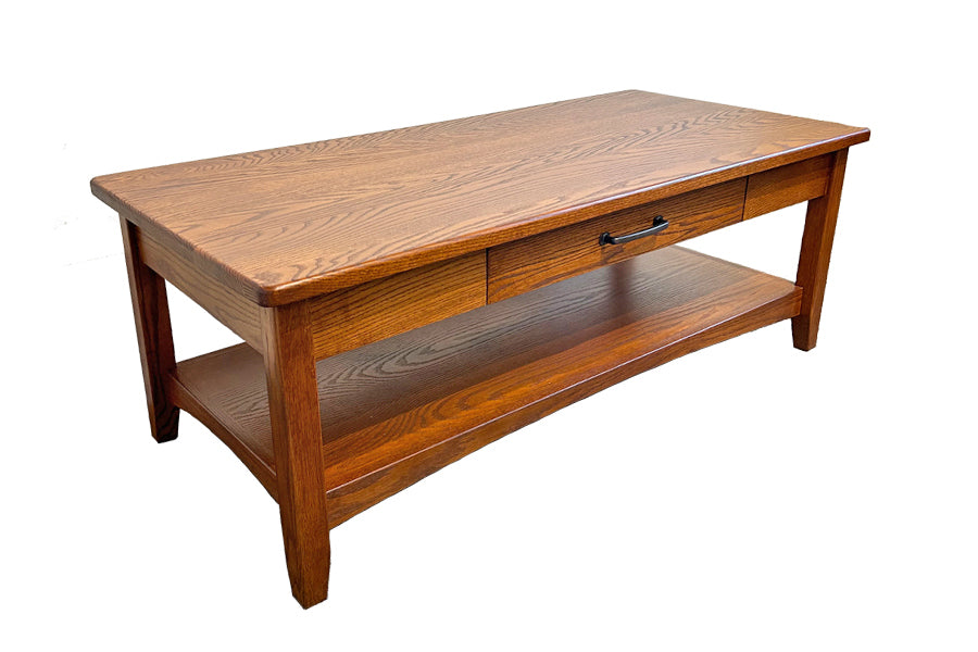 These coffee tables come standard with one drawer and one shelf below. The drawer box is constructed with solid pine and slides smoothly on full extension ball-bearing glides.