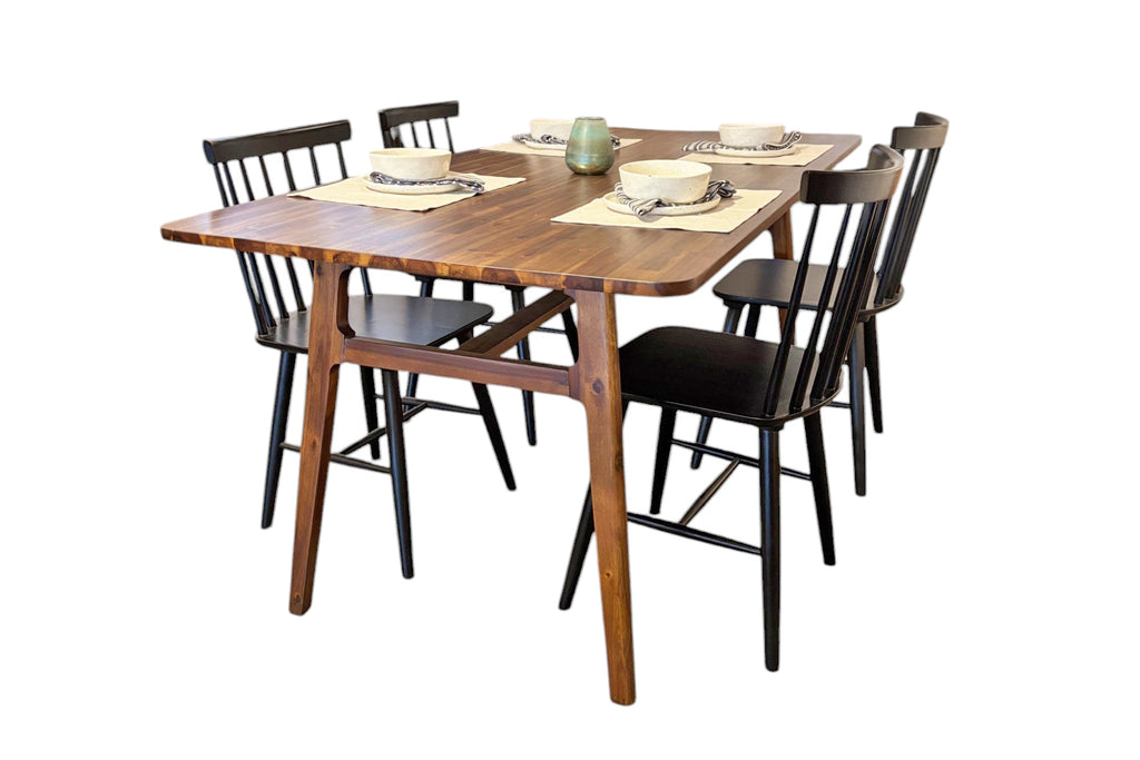 The Retro Dining Table is inspired by a sleek mid-century modern design. It is made from solid Acacia wood and pairs beautifully with the Retro Dining Chairs for a nice contemporary look.