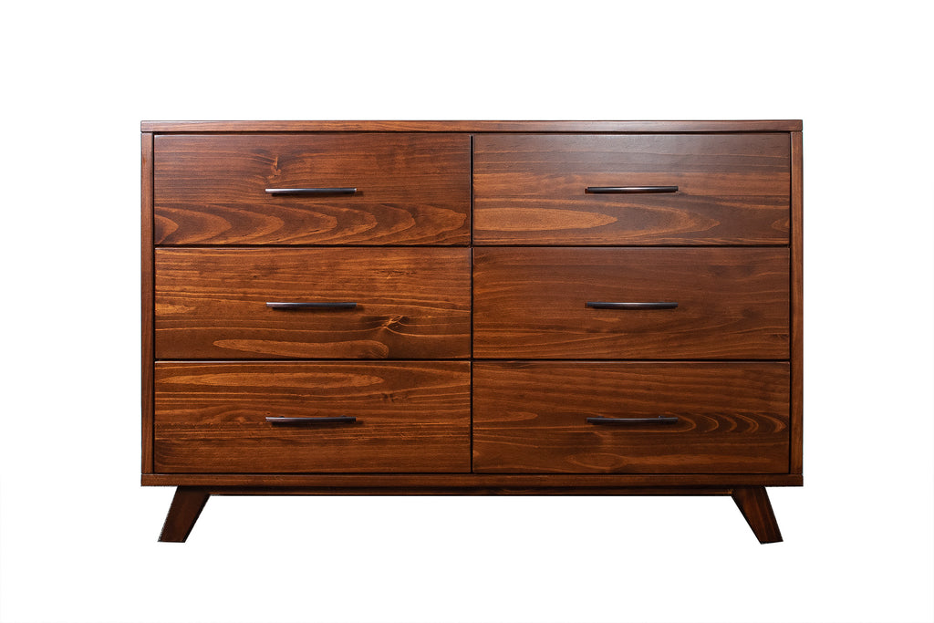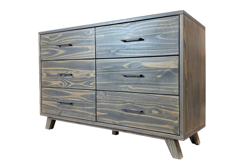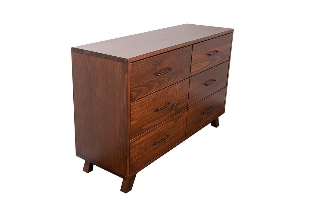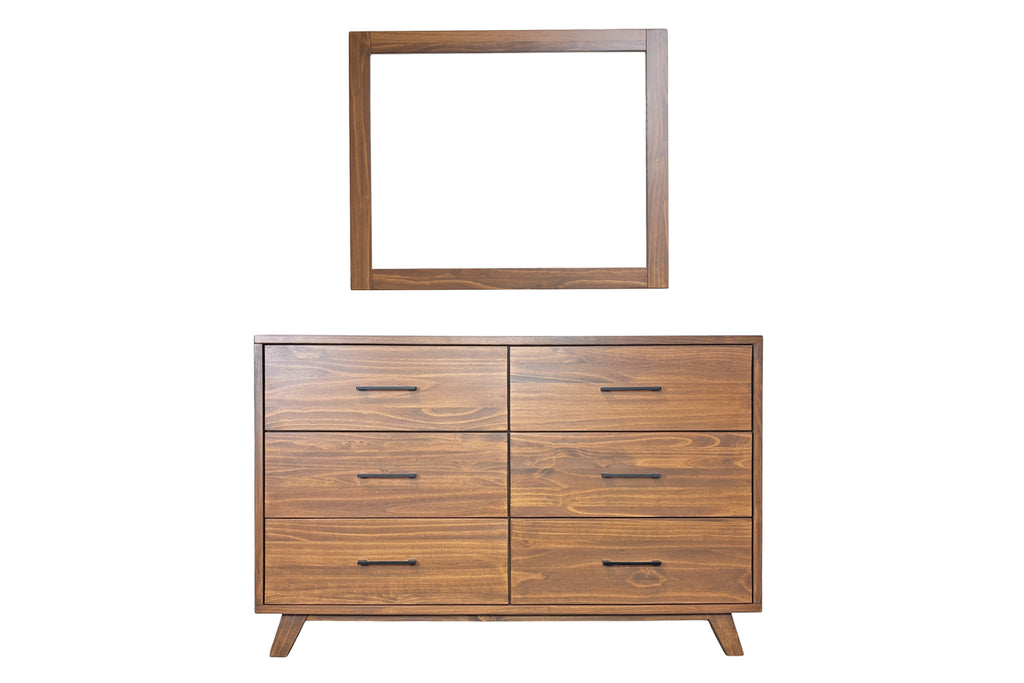 This dresser is made in BC with solid pine and comes standard with dovetail drawer boxes and ball bearing glides. It is available in 13 different stains by an 8–10 week order. A matching, 39" wide x 34" high, detached mirror can also be added to this dresser if desired.
