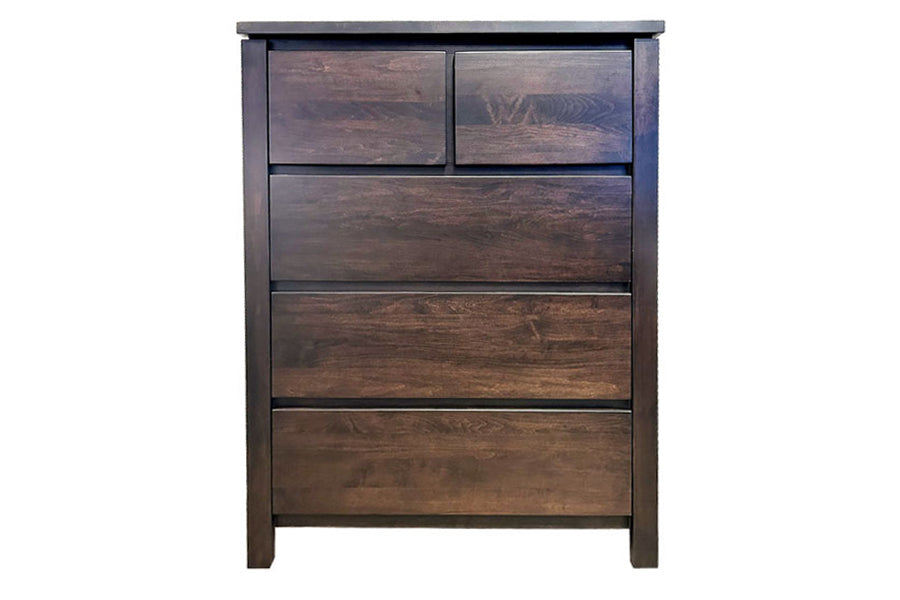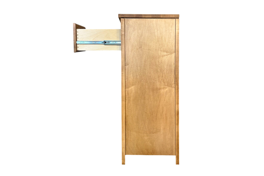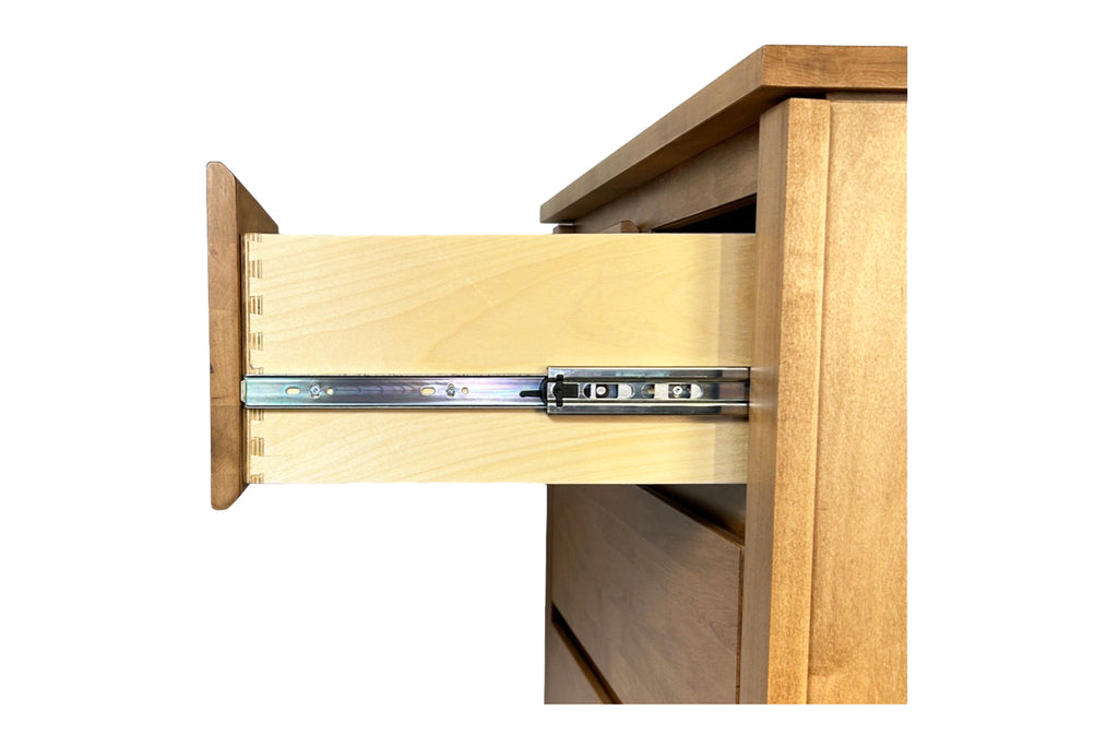 This BC-made Chest is available in multiple finishes on solid maple, with your choice of hardware. The clear finished and sealed drawer boxes slide smoothly on ball bearing glides. This collection is available with soft close glides and wire brushed tops as upgrades