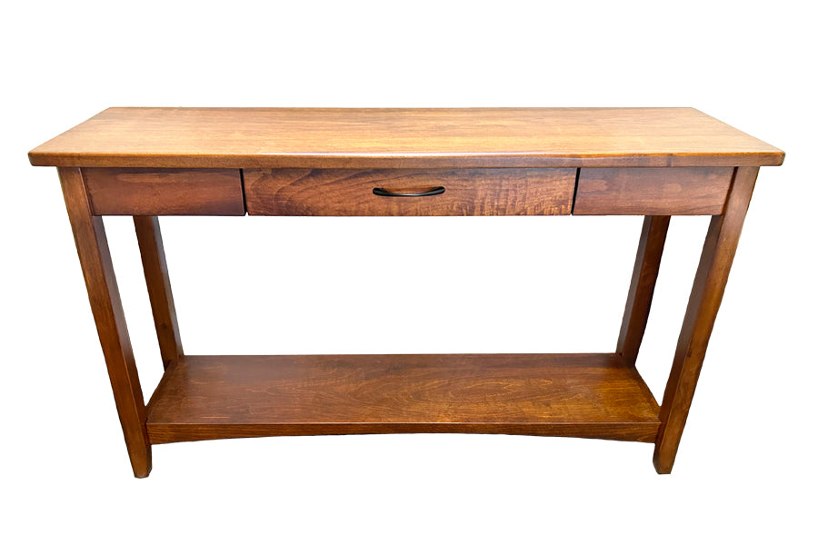 These BC-made sofa tables are available in multiple finishes on solid maple or oak with your choice of hardware. They come standard with one drawer and one shelf below. The drawer box is constructed with solid pine and slides smoothly on full extension ball-bearing glides.