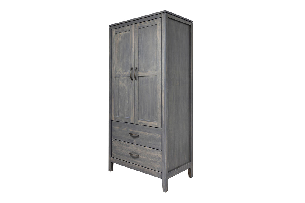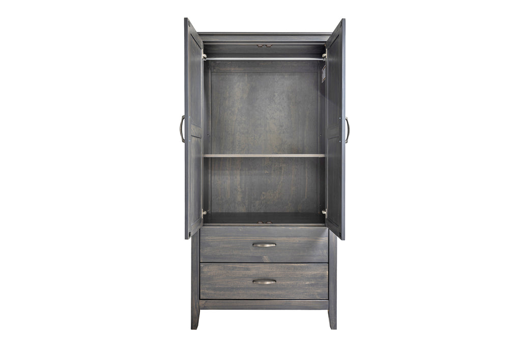 The Robina Armoire features a hanging rod in the cabinet and 2 deep drawers below. It comes standard with full extension ball bearing glides, and metal handles (knobs are not available).